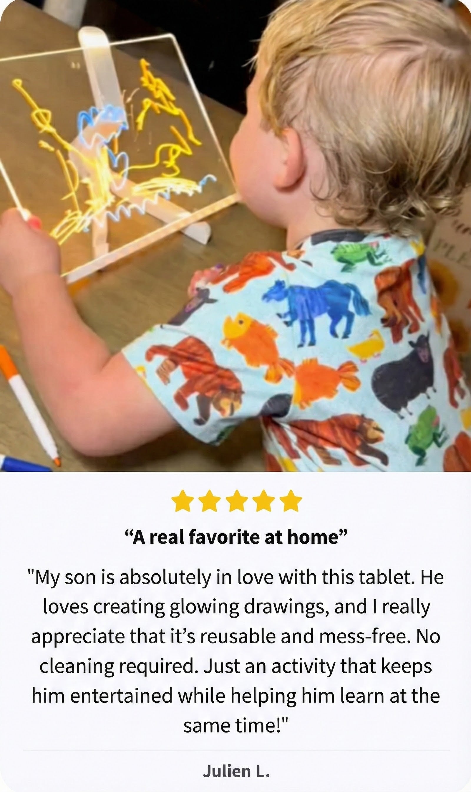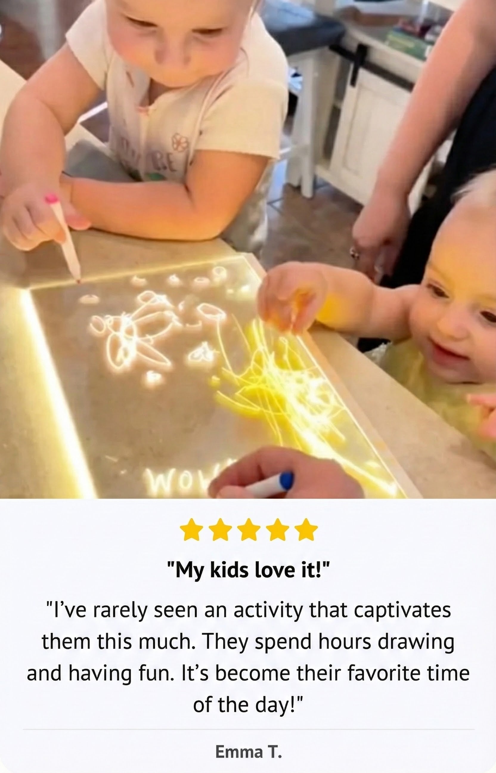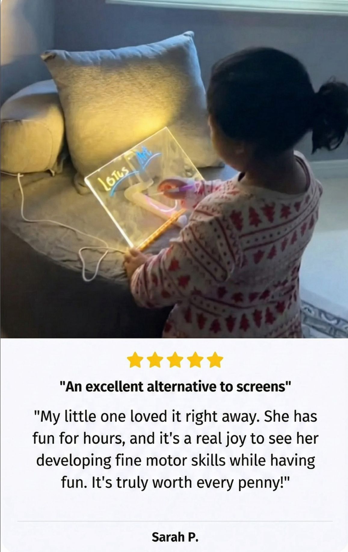"As a licensed occupational therapist, I regularly recommend the Wondiko drawing tablet in my practice.It supports the development of fine motor skills, hand-eye coordination, and concentration without the use of screens.The glowing surface provides immediate visual feedback, ideal for maintaining children's attention.It is especially beneficial for those with ADHD, autism spectrum disorder, or specific sensory needs.This is not just a toy: it's a genuine therapeutic tool disguised as playtime."